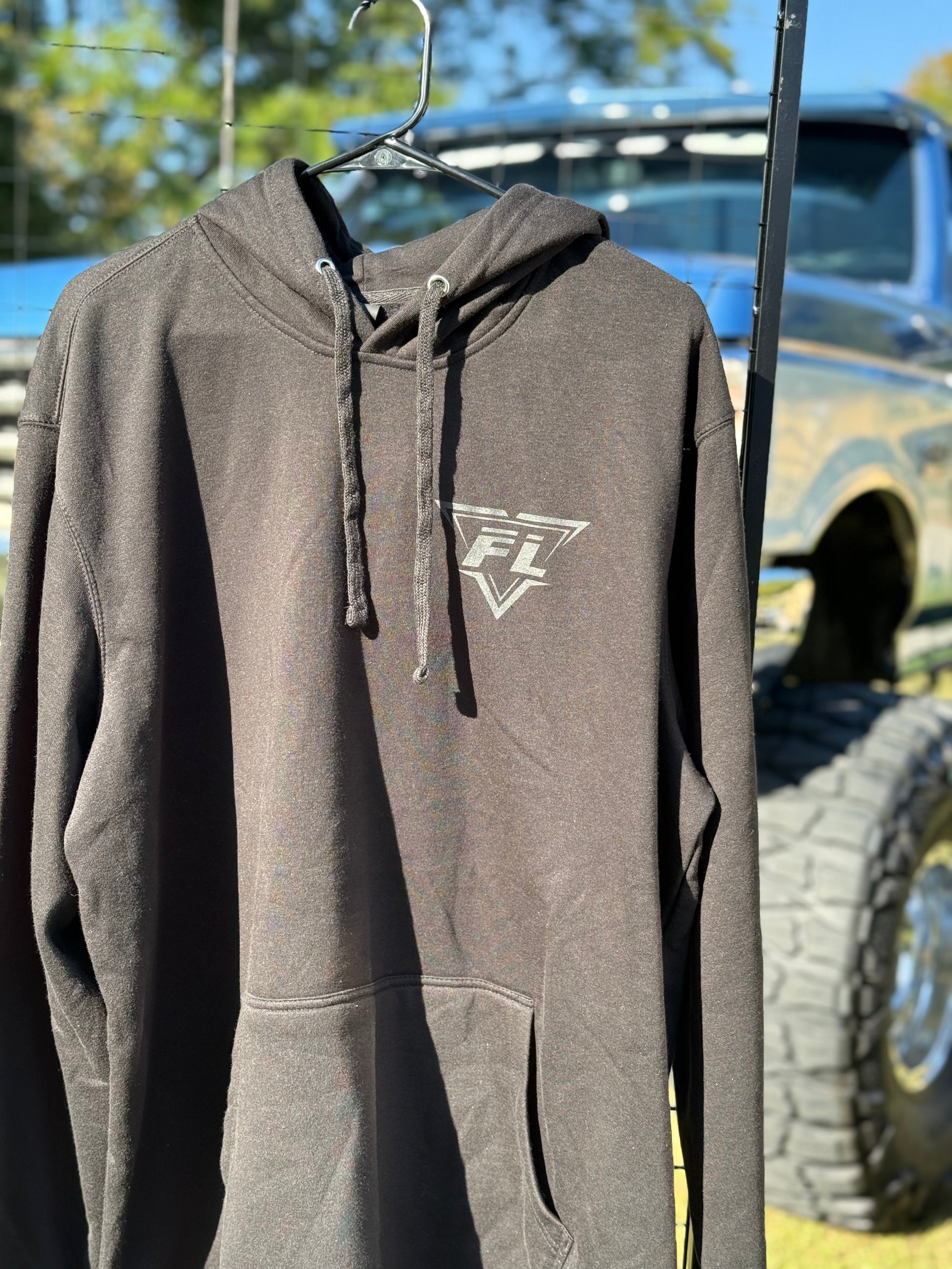 Black hoodie with a black shadowed logo, for a subtle and clean look